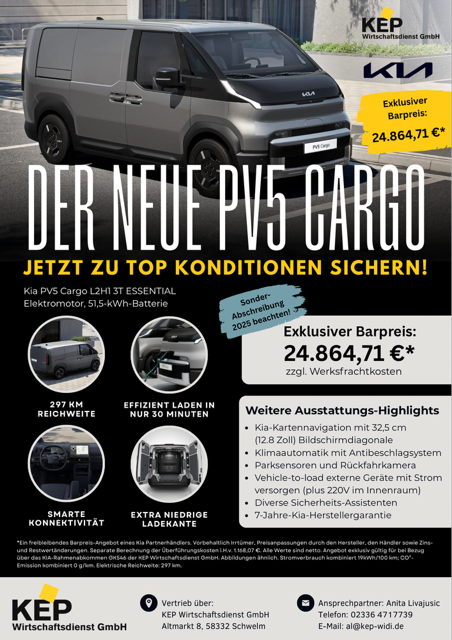 Gemeinsam mit Kia bieten wir Unternehmen in Transport und Logistik nun attraktive Konditionen für die gesamte Flotte – von PKWs bis hin zum neuen PV5 Cargo. So wird Elektromobilität nicht nur möglich, sondern wirtschaftlich planbar.
